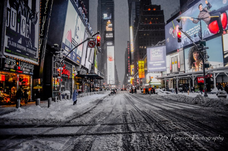 Seventh Avenue during a heavy snowstorm.