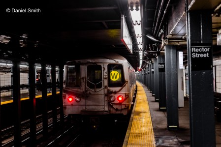 W Train leaving Rector Street in Lower Manhattan.