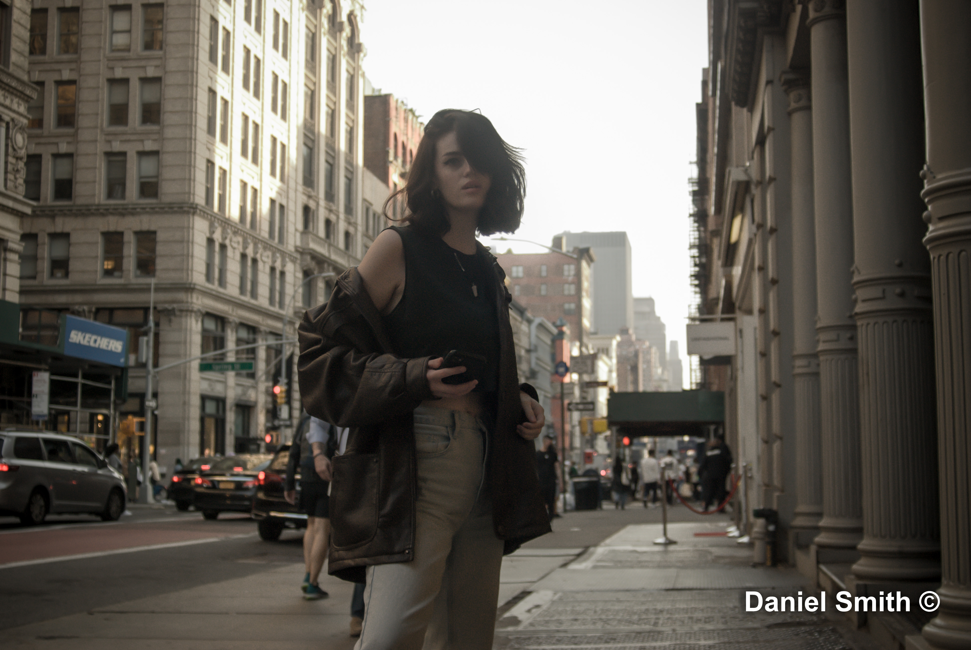 Model posing along Broadway and around Grand Street.